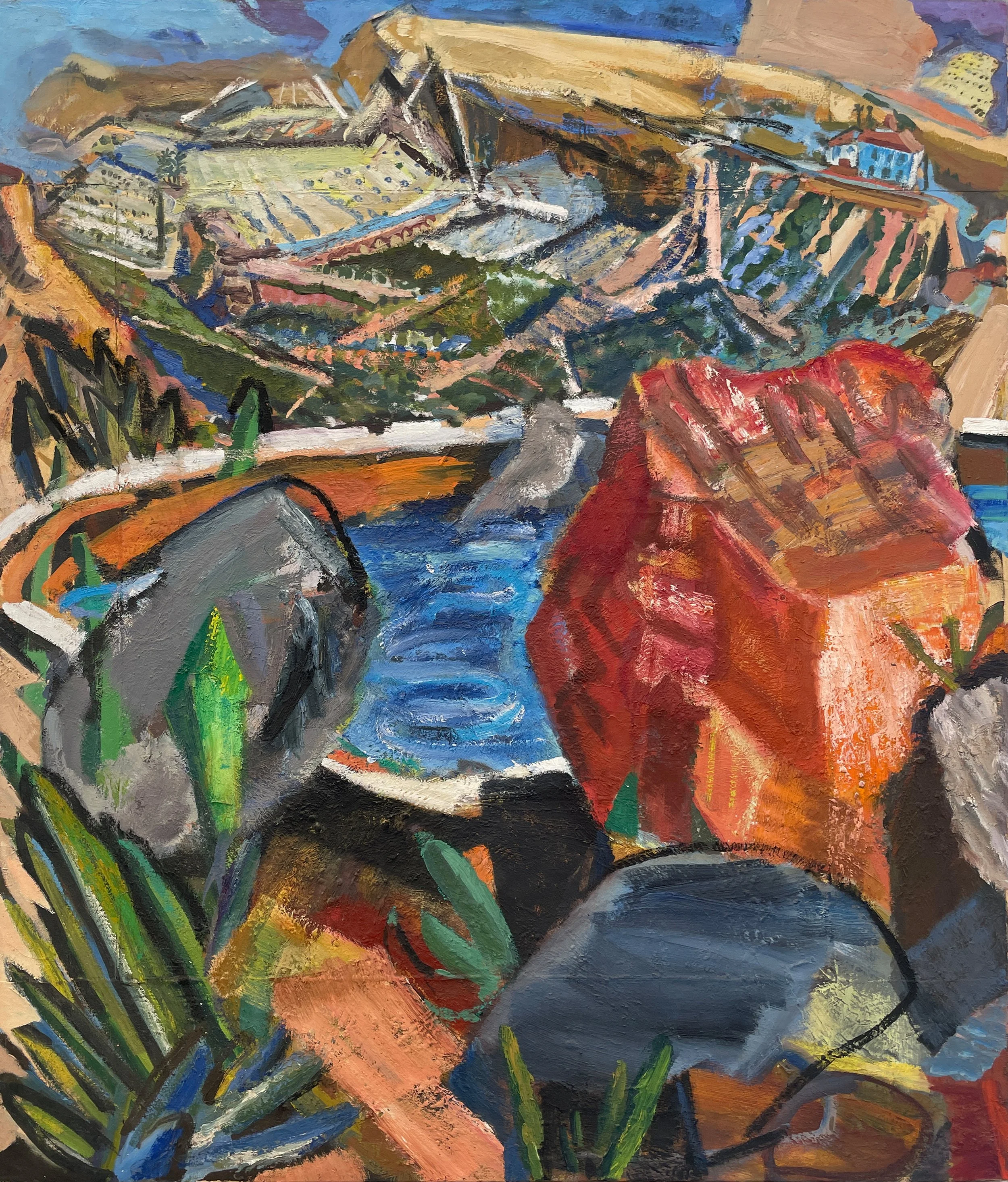 Lynette Lombard, “Over the Boulders Mojacar, Spain,” oil, glued canvas, 60 x 51.5