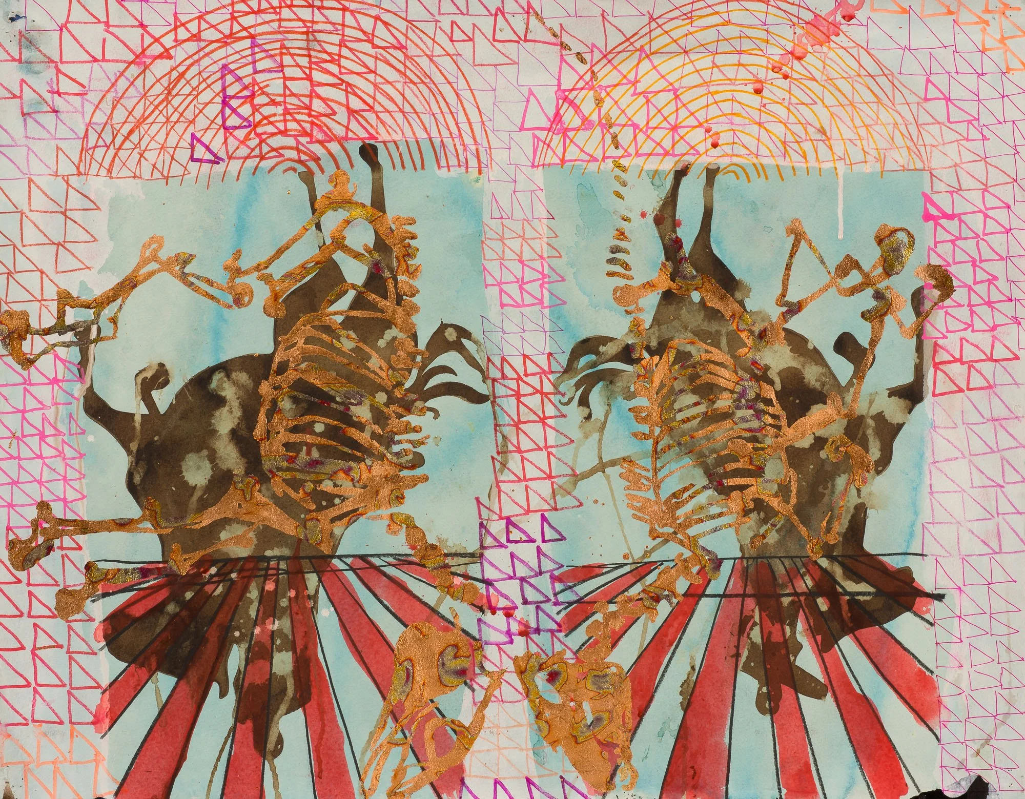 Andy Ness’ works vibrate with ethereal energy, glowing with metallic leaf, and grounded by recognizable imagery amongst colorful washes and textures. To achieve the widest range of opacity and transparency in his drawings, Ness mixes pigments and binders, incorporating walnut ink for its fugitive traits. As one of the primary inks used by medieval manuscript illuminators, its qualities become philosophically resonant as it shifts and oxidizes over time, paralleling the medieval sense of knowledge as always partial, always subject to revision. Just as encyclopedias are living documents rather than fixed authorities, so, too are Ness’ works, in a state of constantly arriving, finding voice from what came before.